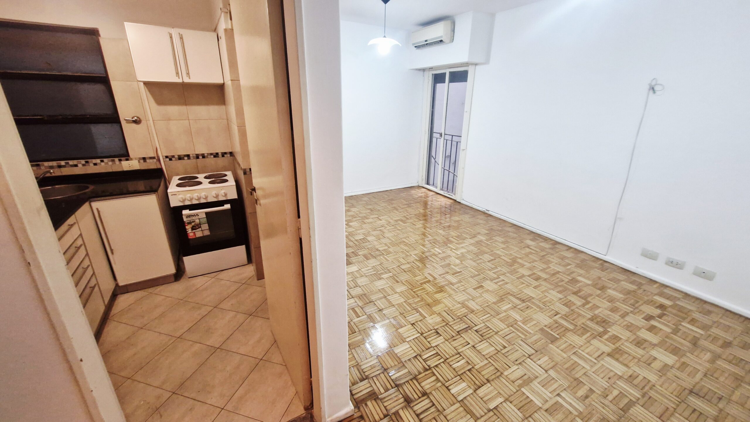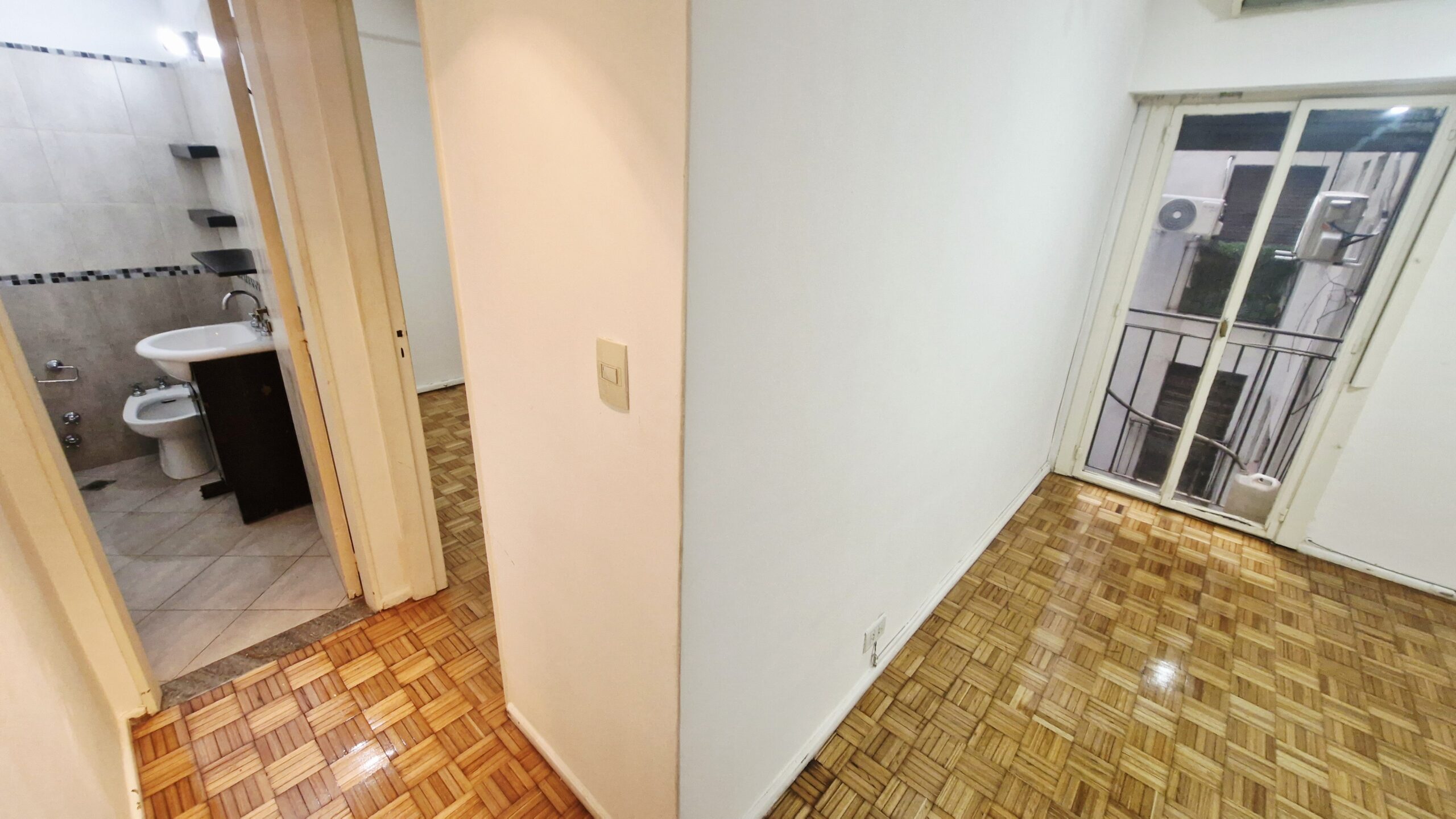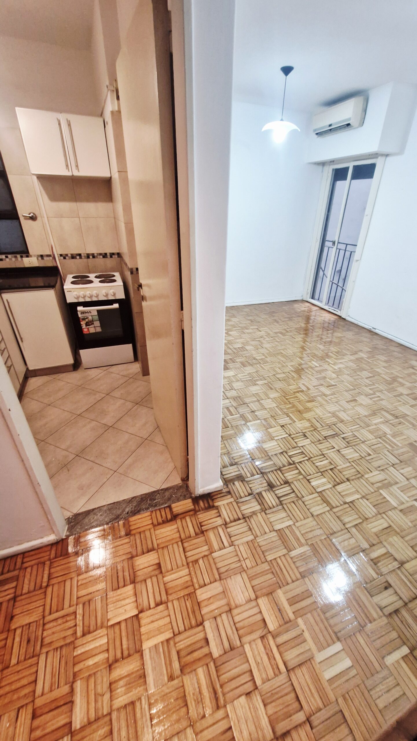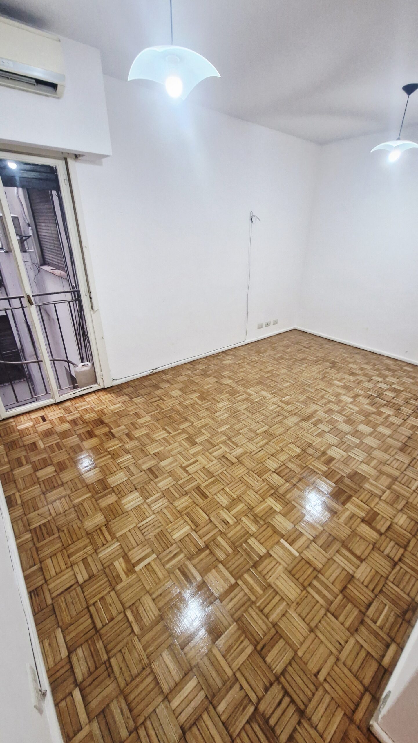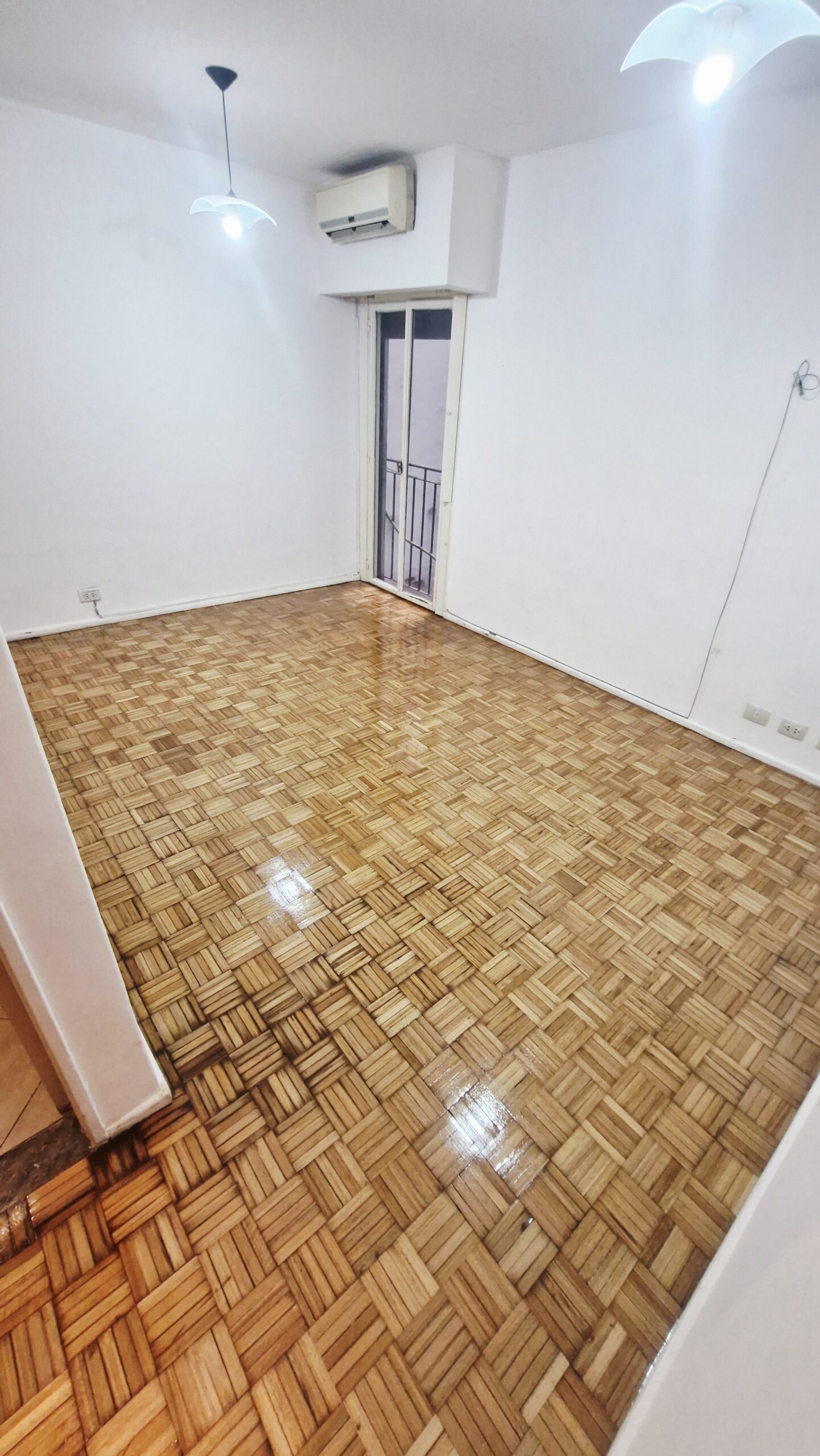 Living comedor con piso de parquet plastificado, aire acondicionado y balcón francés.