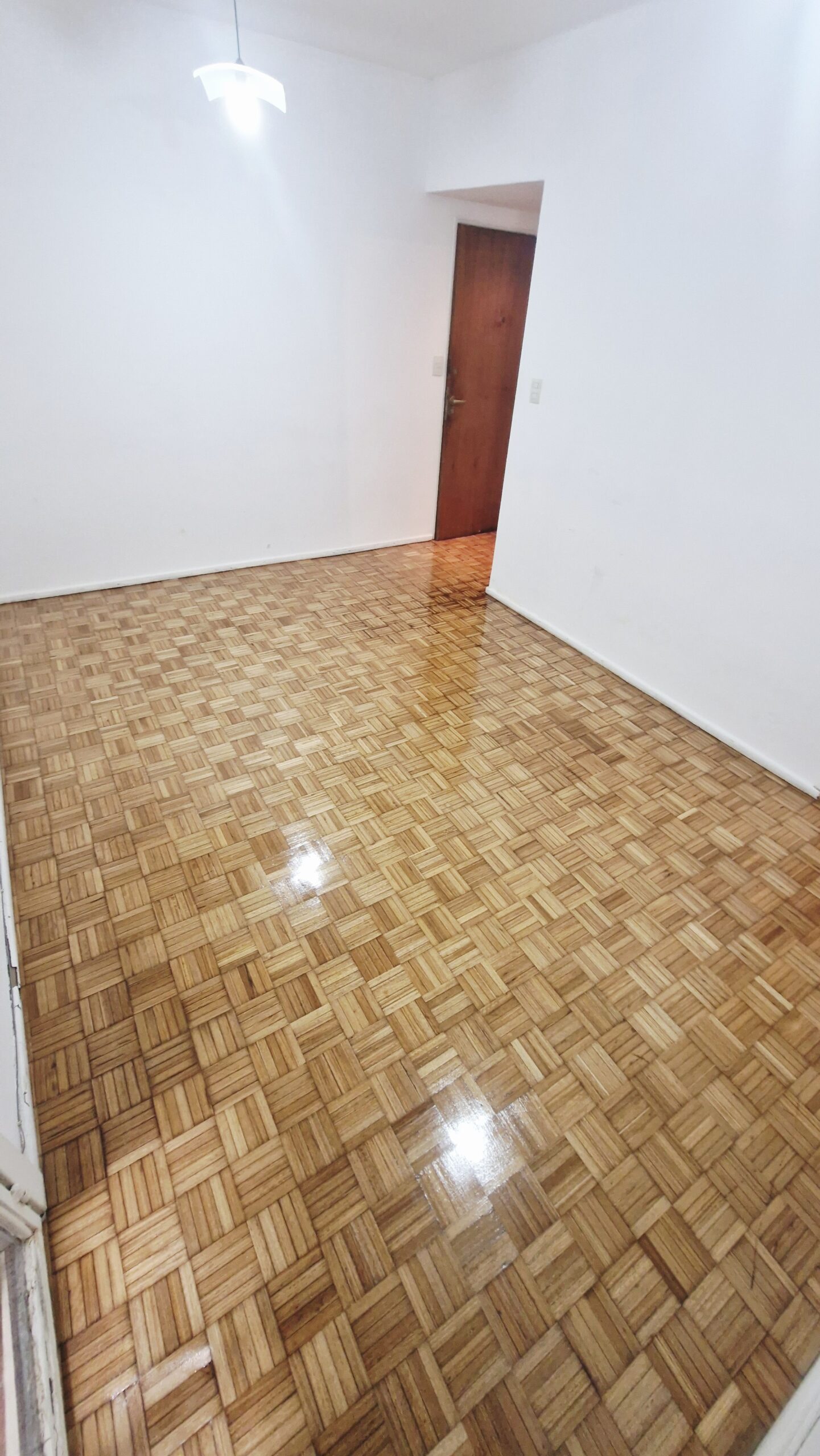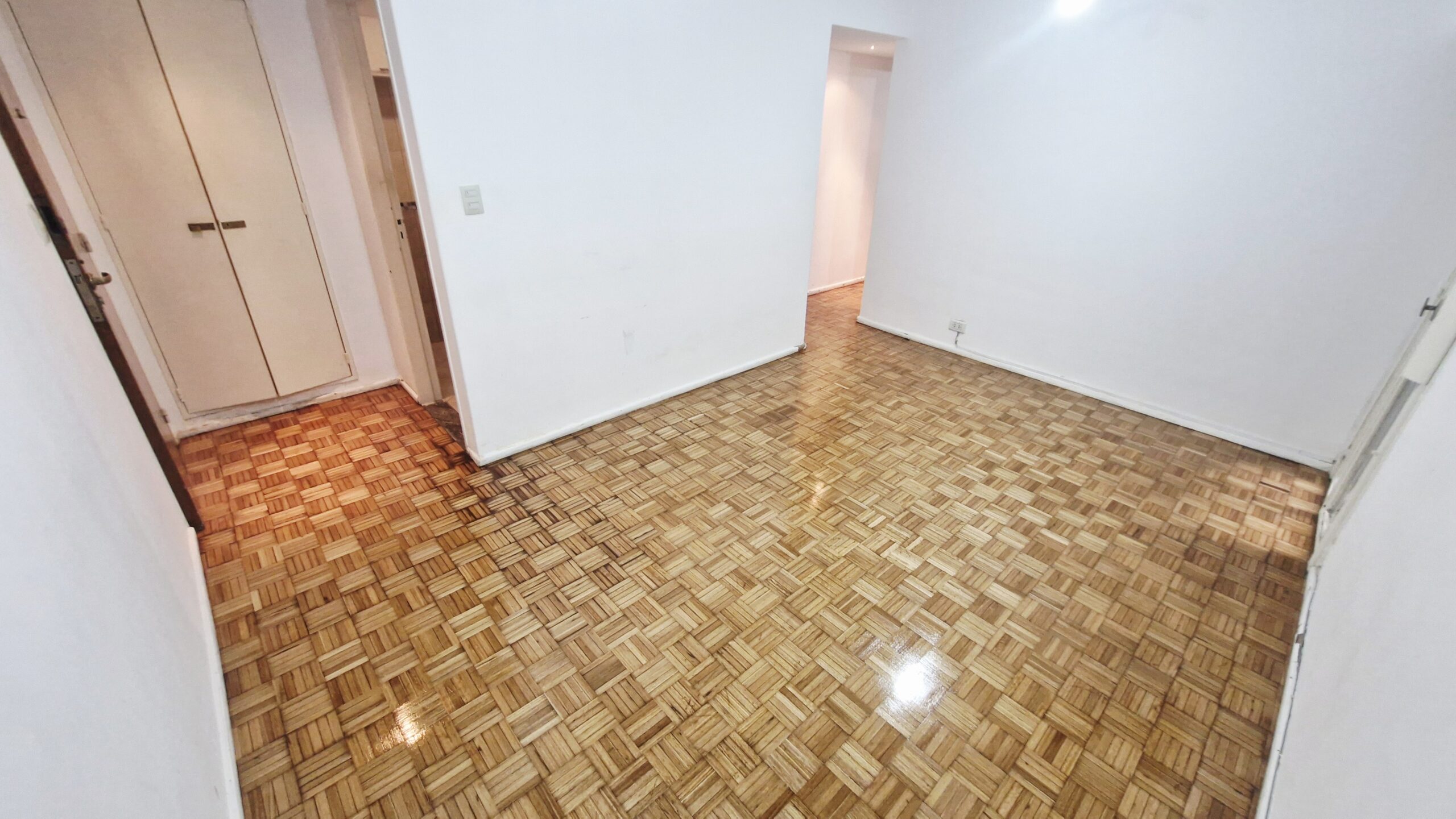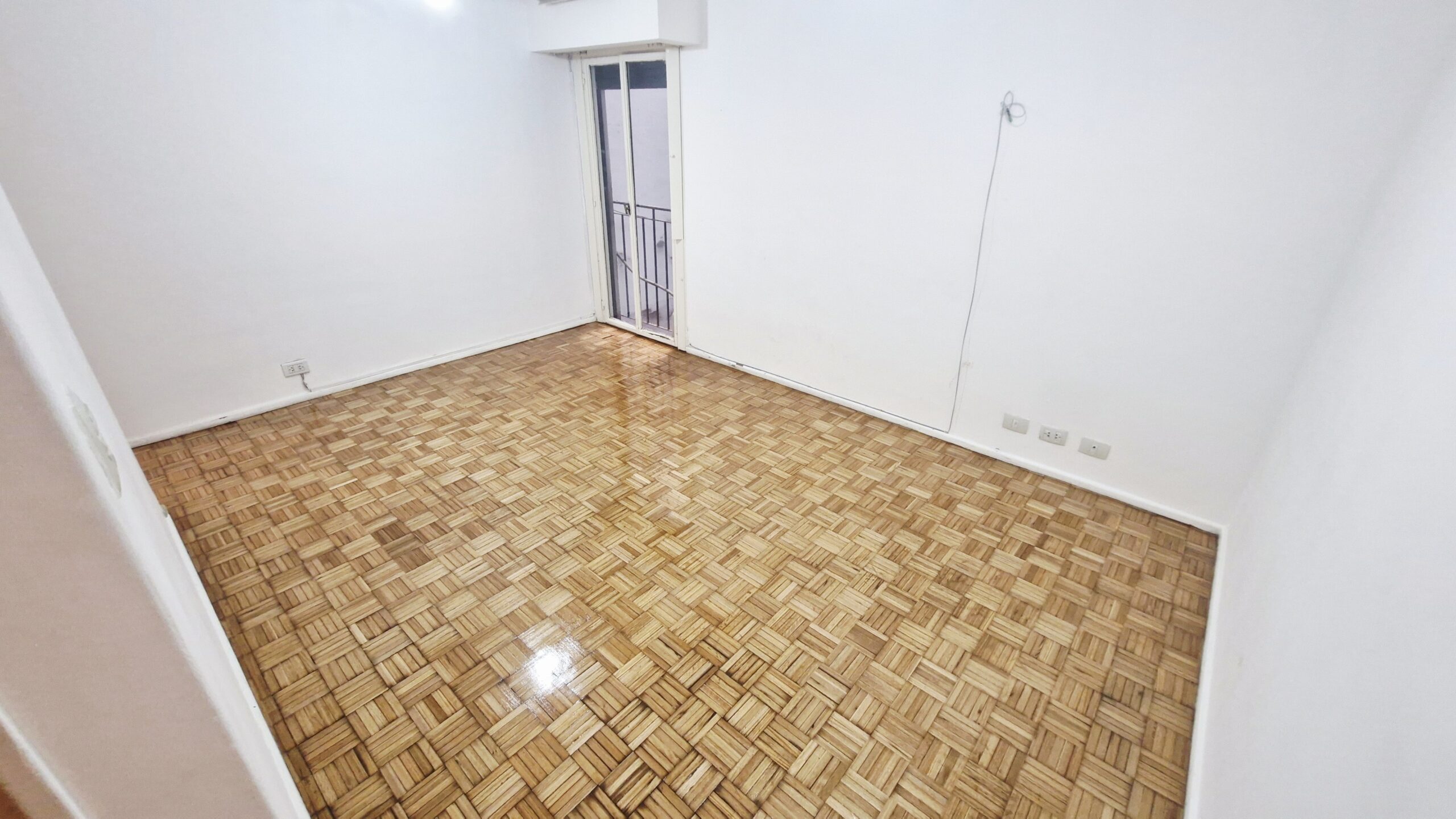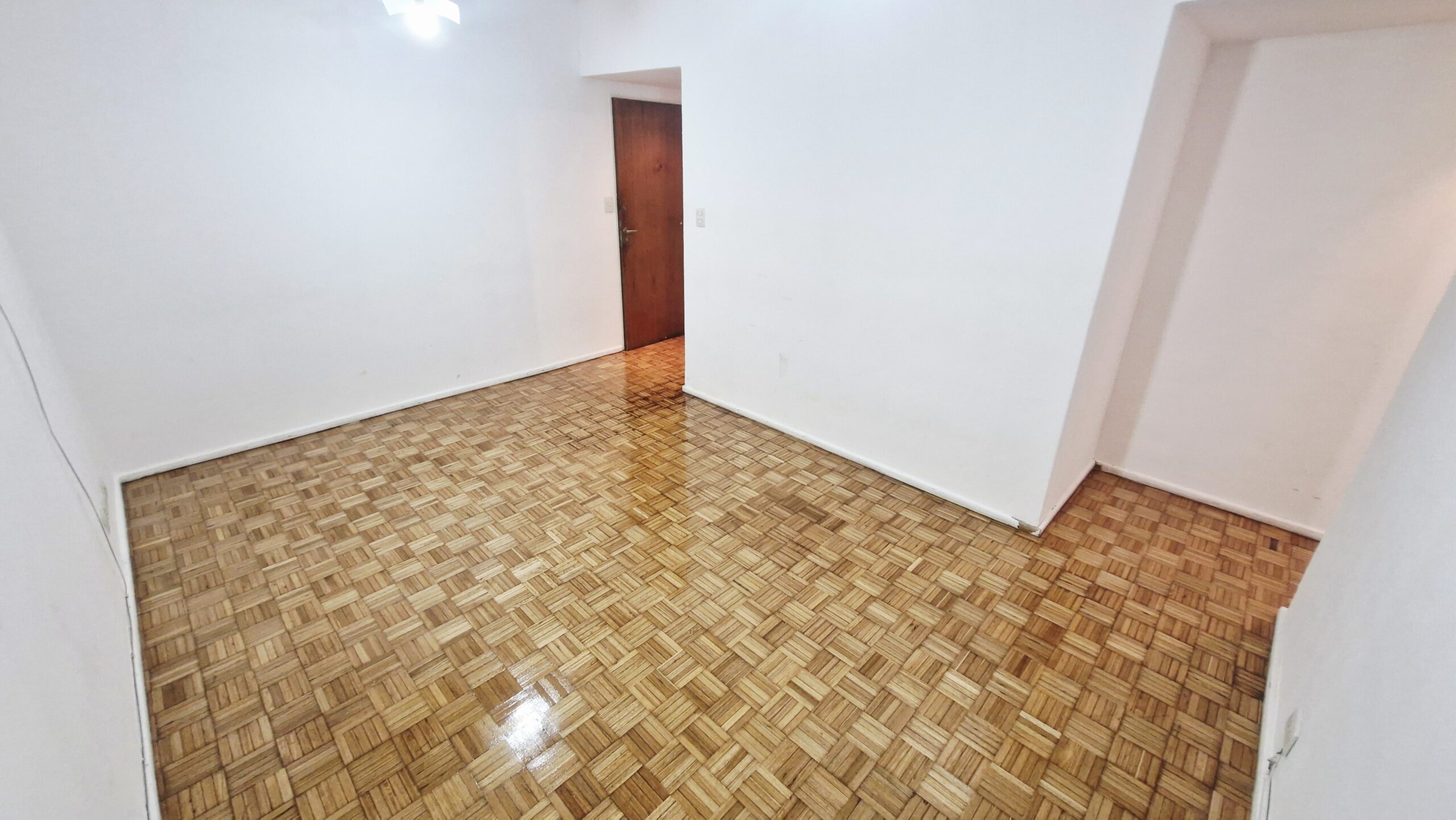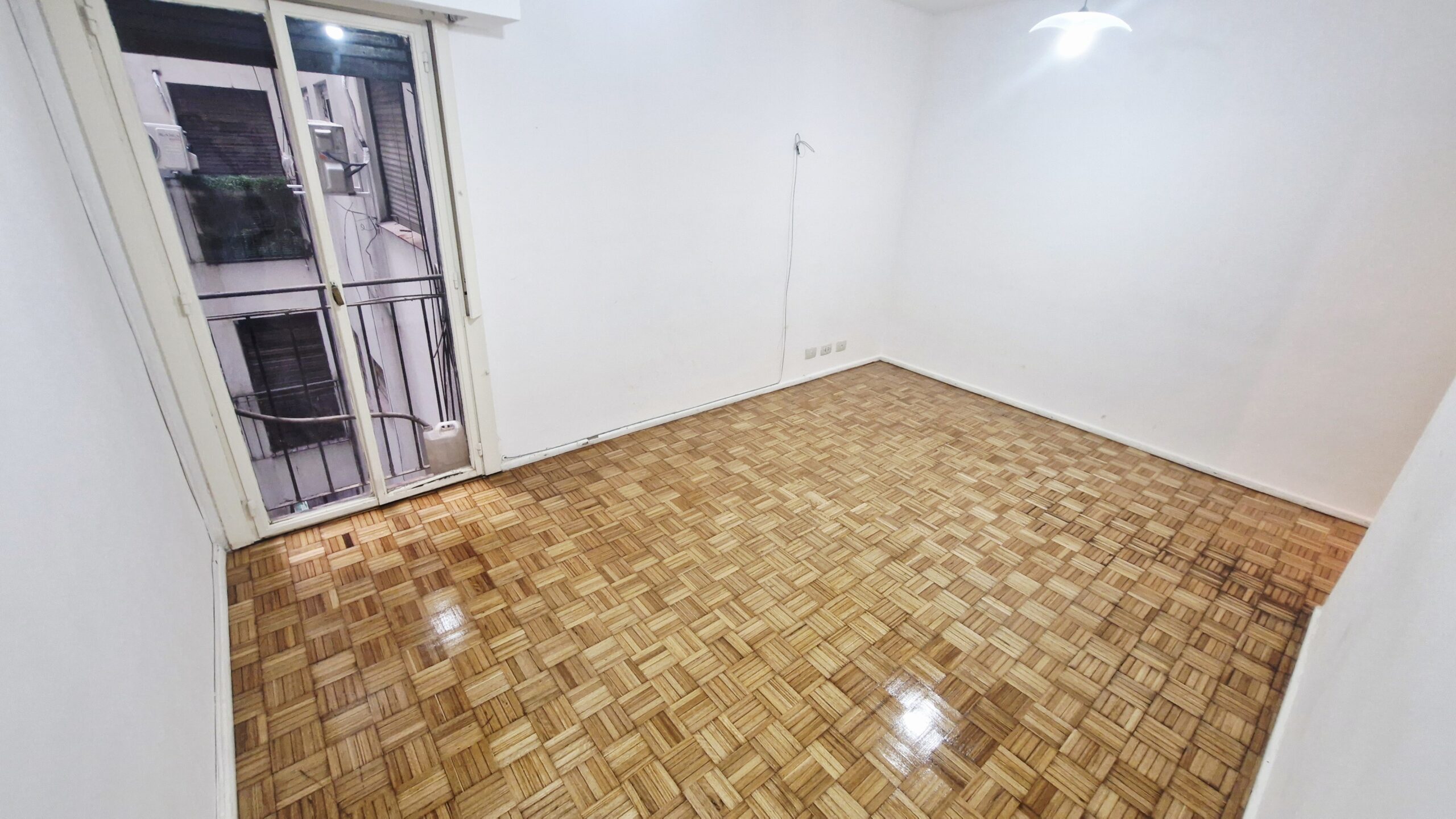 Living comedor con piso de parquet plastificado, aire acondicionado y balcón francés.