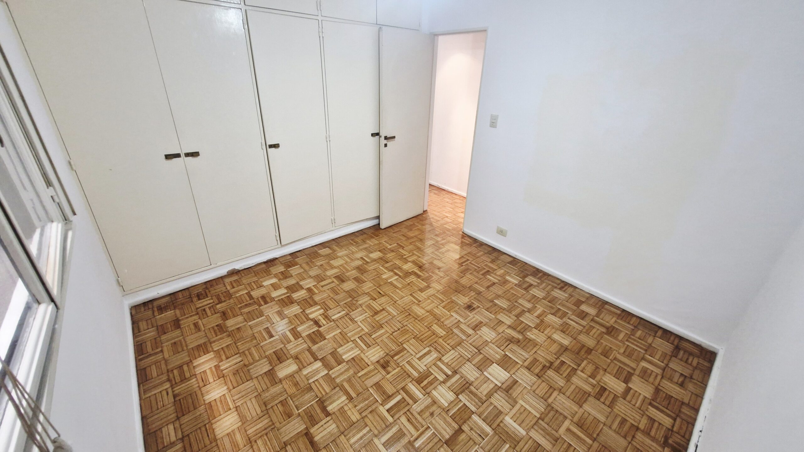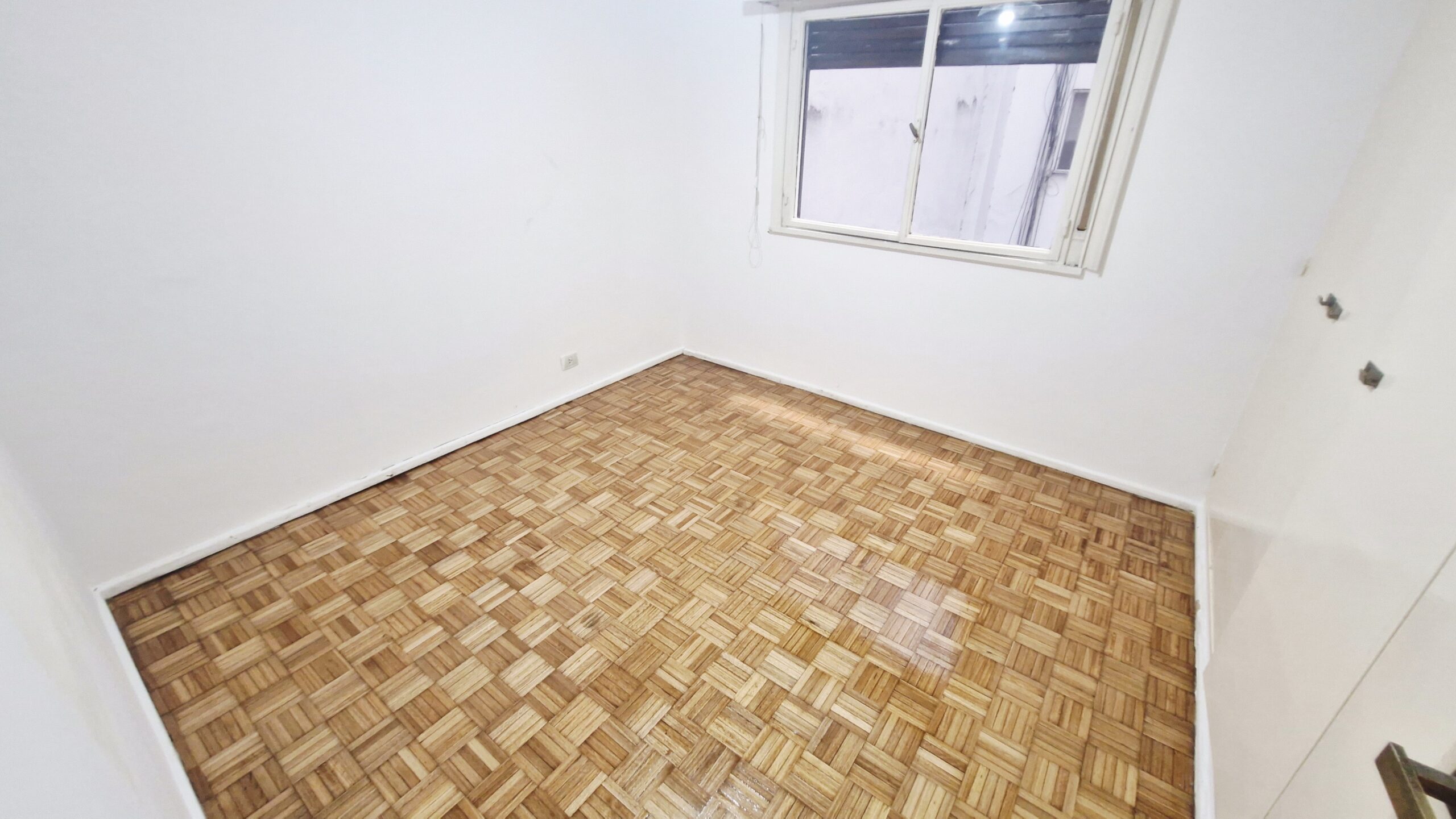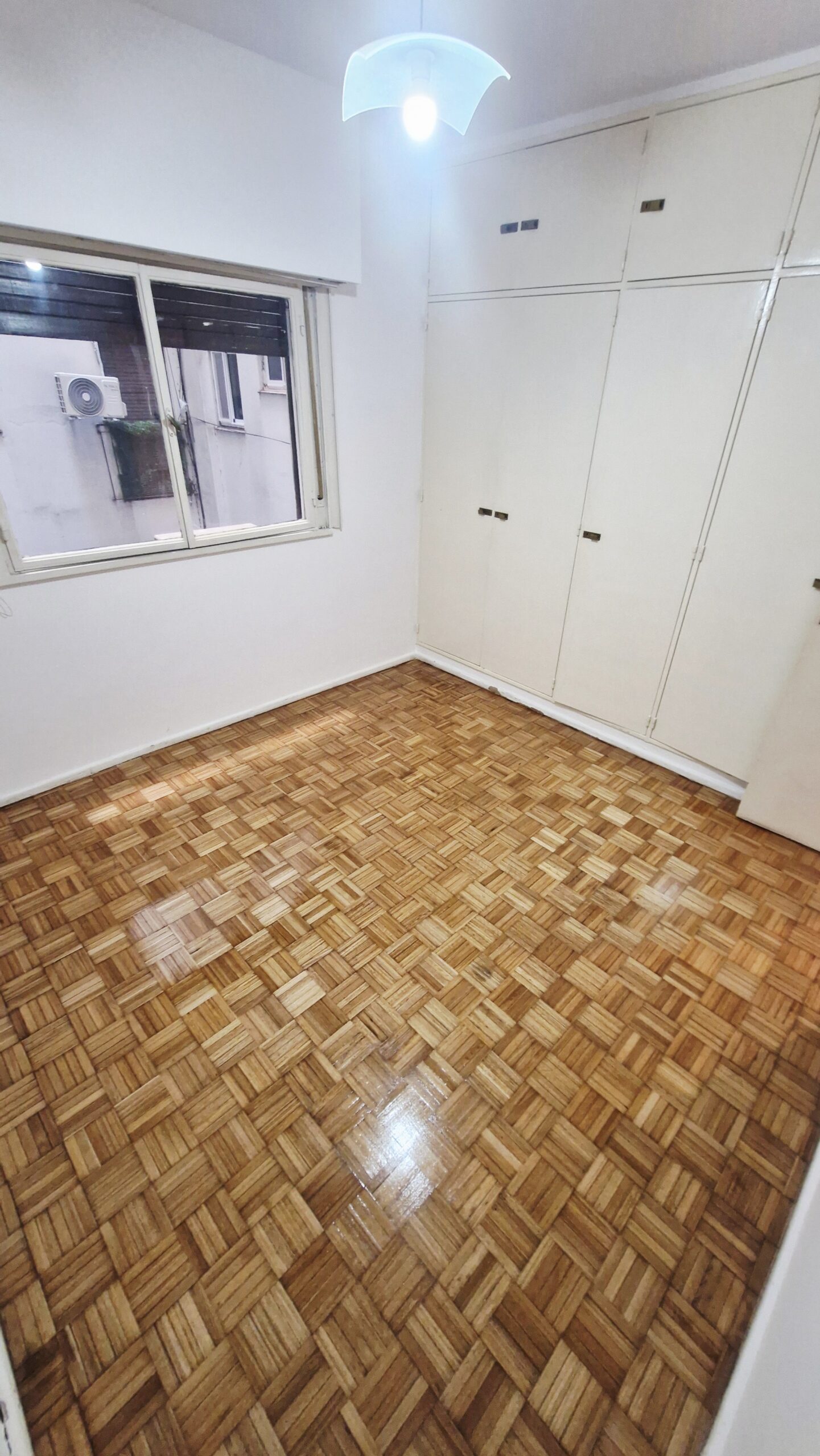 Dormitorio con piso de parquet plastificado y placard