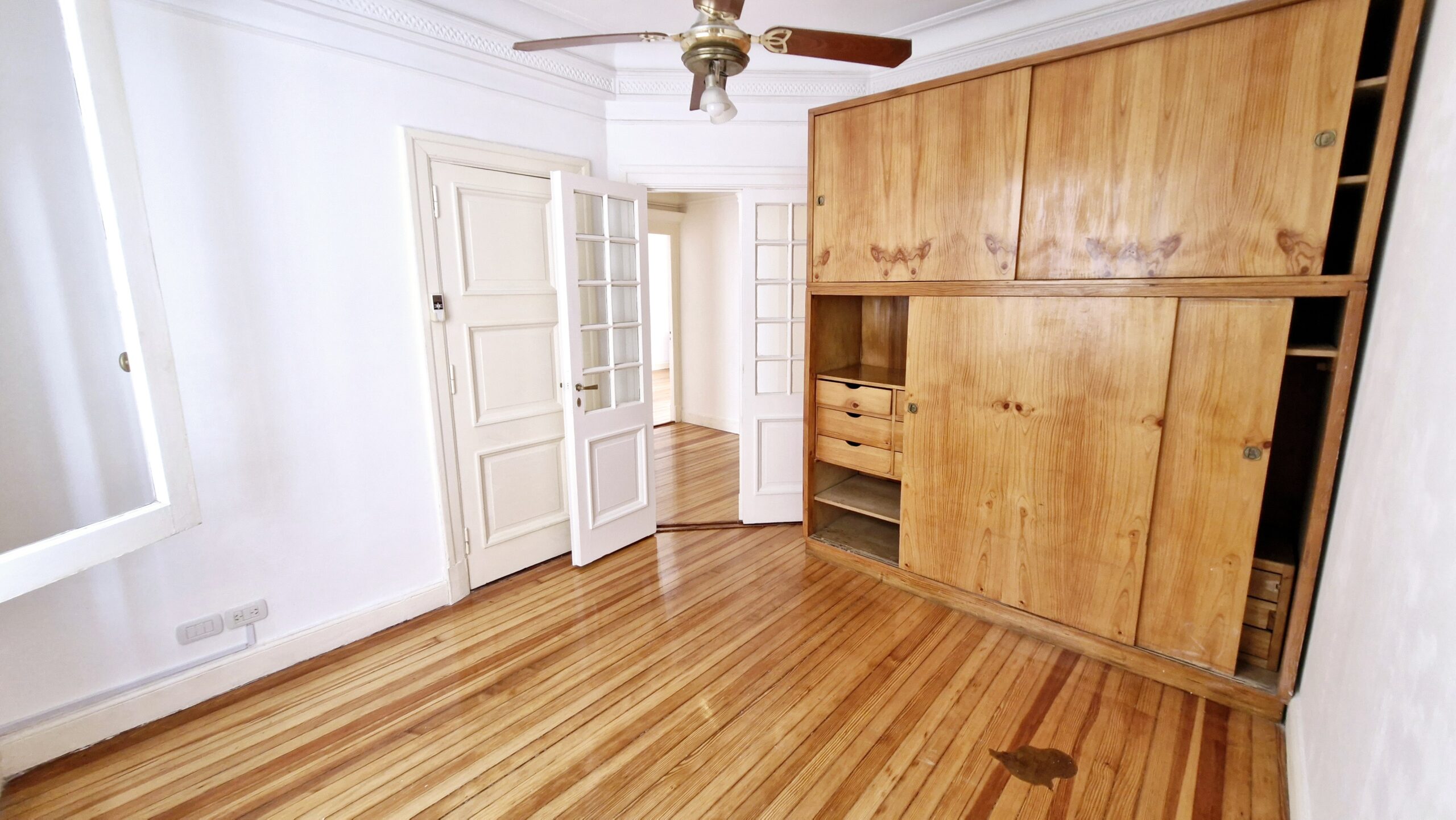 Dormitorio principal con placard, aire acondicionado y ventilador de techo.