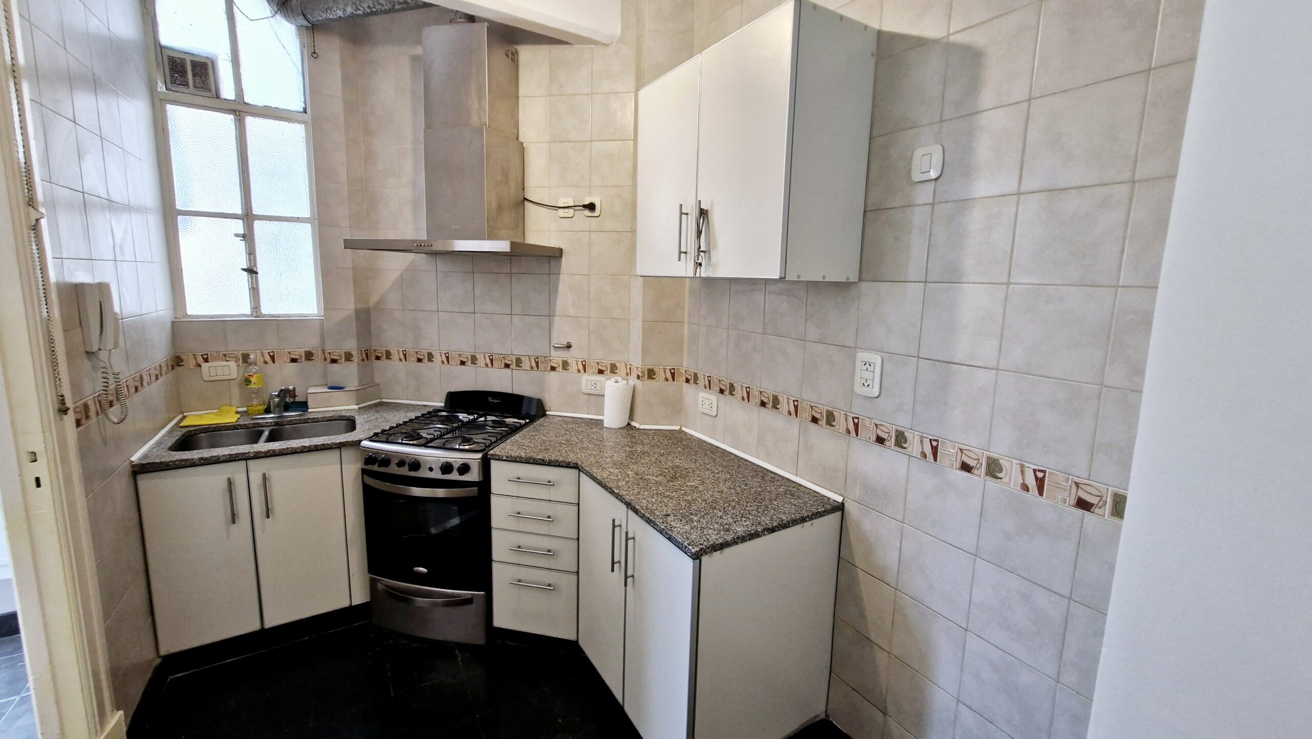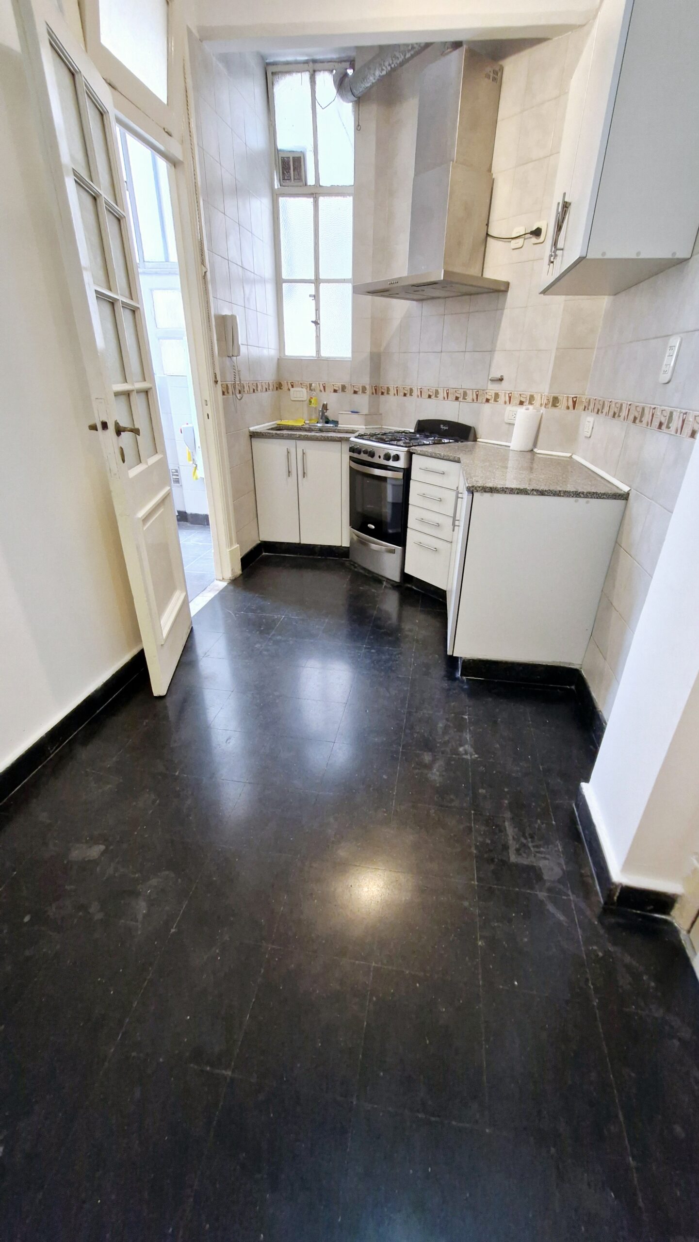 Cocina completa con muebles bajo mesada, alacena, extractor de aire y entrada de servicio.